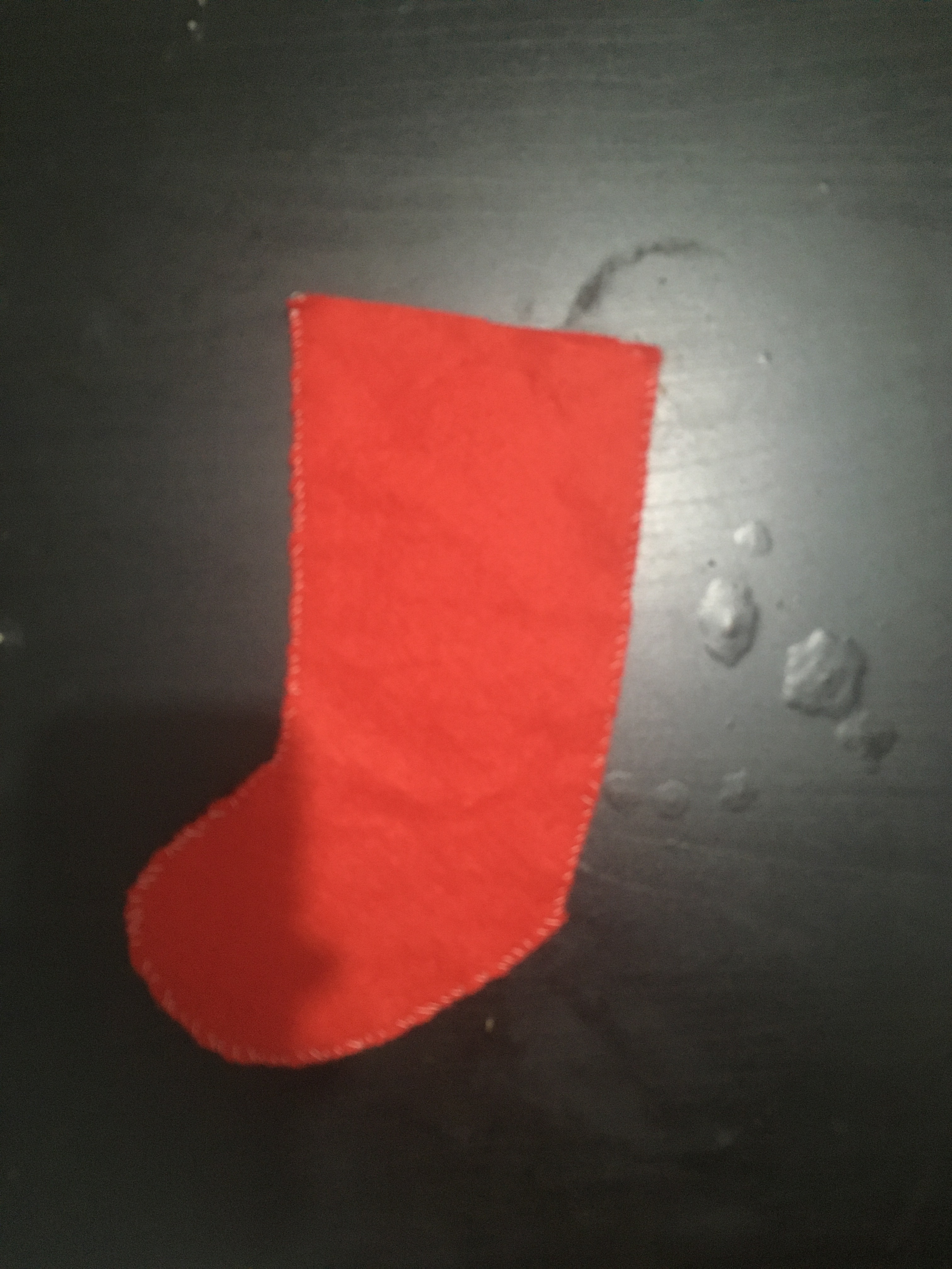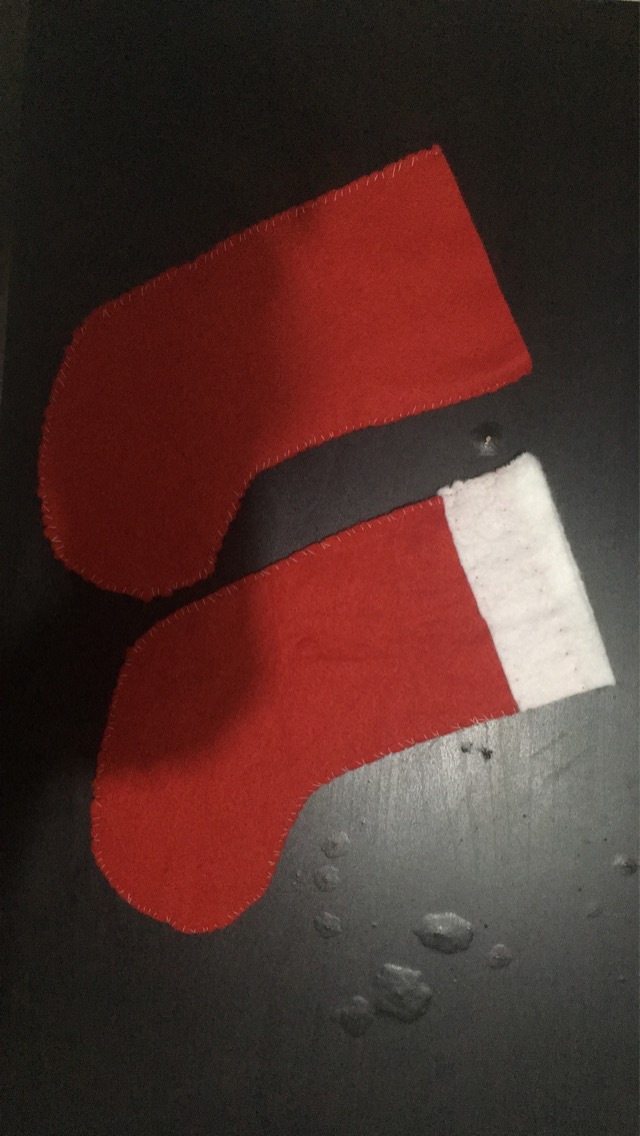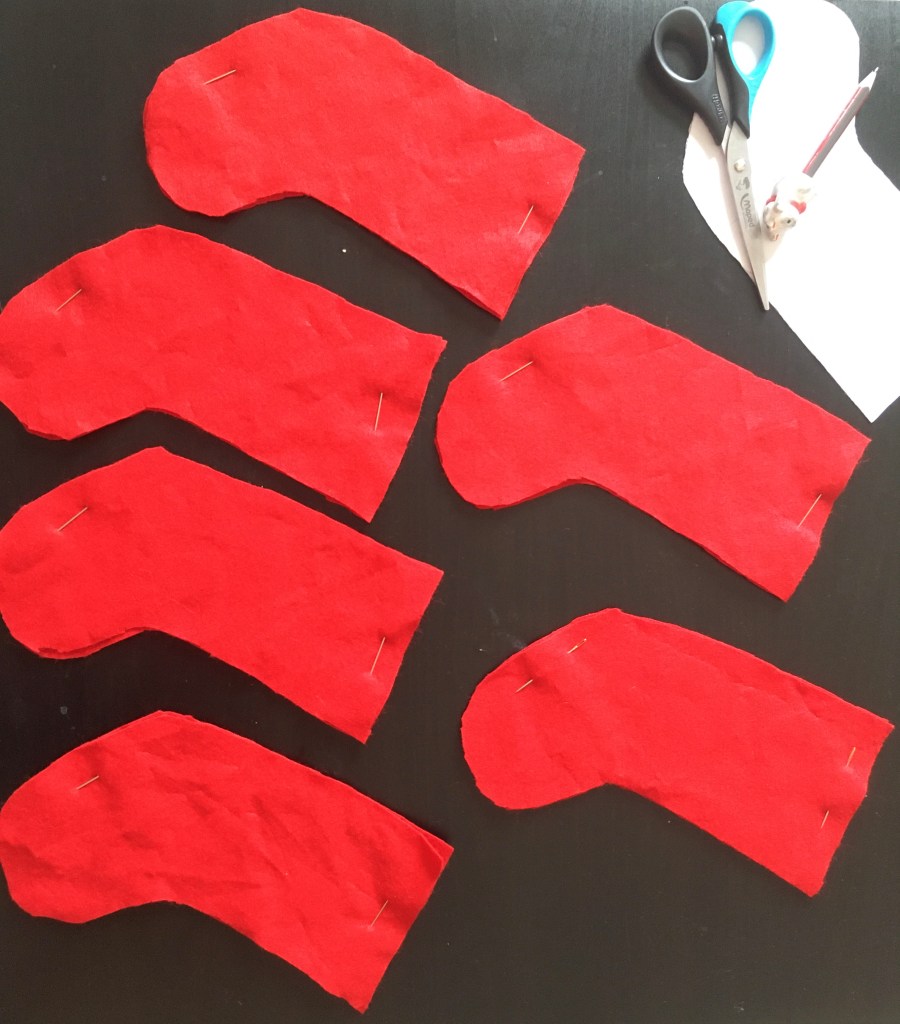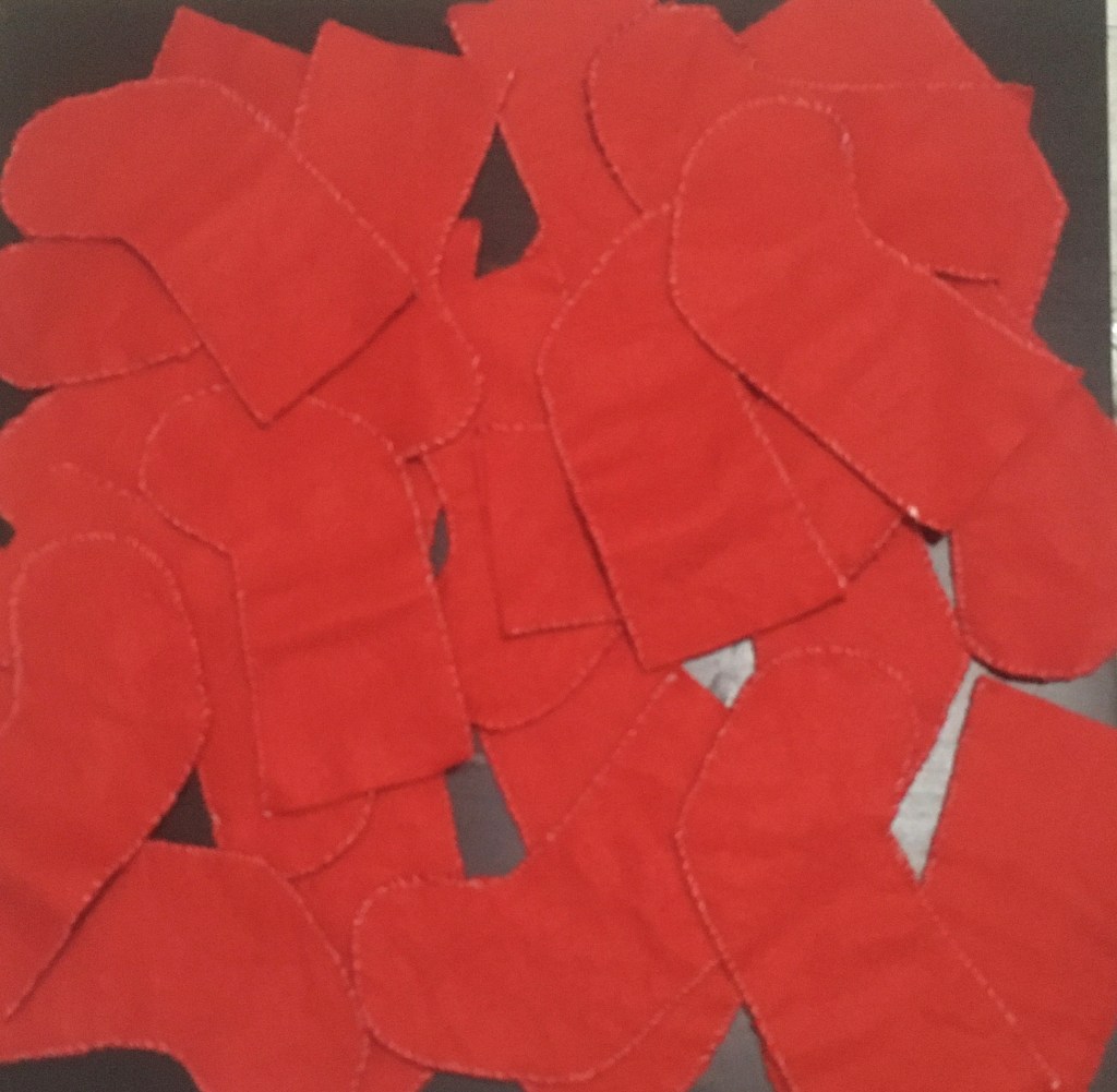 Ensuite j’ai découpé dans ma feutrine rouge mes chaussettes avec l’aide mon patron. J’ai fait le contour de mon patron avec un crayon de papier car je n’avais pas avec moi une craie ou un stylo pour tissu. Et j’ai ensuite découpé mes 48 chaussettes car il faut deux parties pour faire une chaussette. J’ai relié les deux parties avec des aiguilles car je n’avais pas d’épingles à coudre.