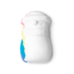 Une bombe de bain lush arc-en-ciel à l’intérieur en forme de bonhomme de neige coûtant 5€, snowman dreaming.