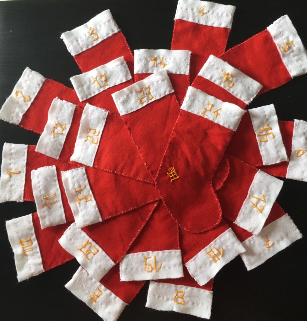 Après avoir fait les 24, je suis passée à la broderie des chiffres. J’ai commencé à essayer de faire des arrondies mais avec des gros points ce n’était pas très esthétique donc j’ai préféré faire des chiffres comme ceux qu’on a sur une calculatrice. J’ai utilisé mon fil doré pour ça et sur la 24ème j’ai fait un petit cadeau au niveau du talon, pour rendre la chaussette un peu spéciale.